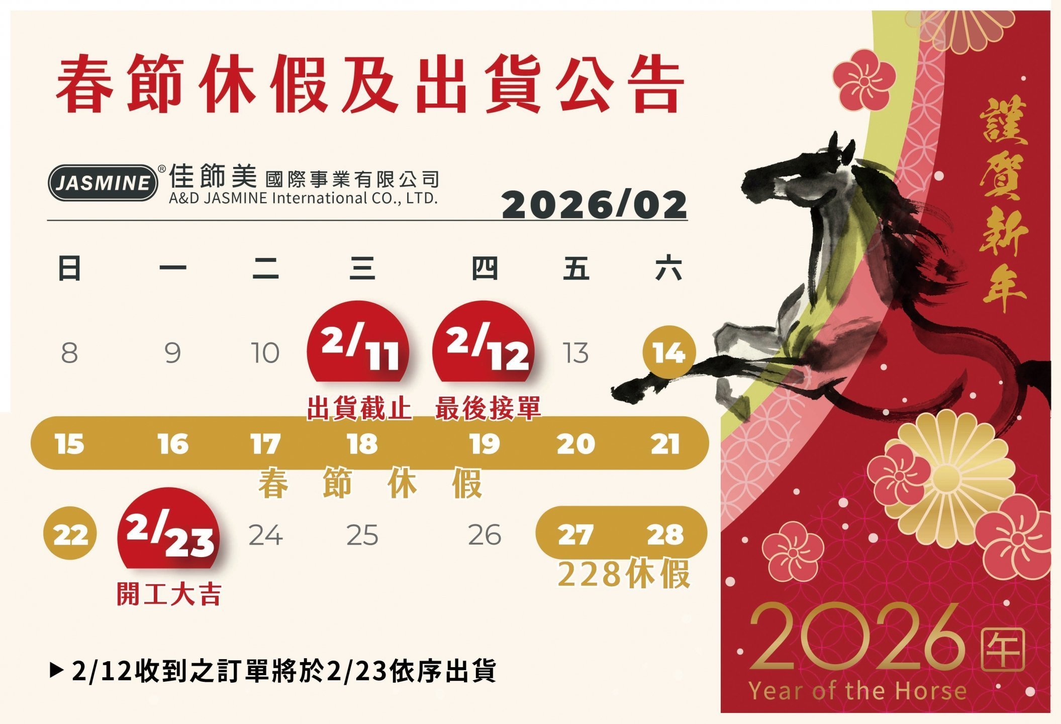 連假期間如造成不便,敬請見諒 🙏🧨 金馬年即將到來,祝福大家新春愉快、馬到成功、生意興隆!