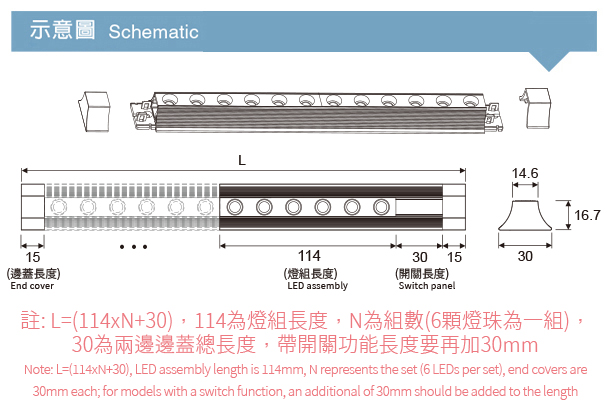 明裝式安裝,方便快速。鋁合金燈體,經硬質陽極氧化處理,耐磨、耐刮、吸熱節能、易清理